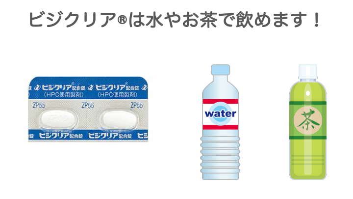 錠剤タイプのビジクリアの最大のメリットは、水やお茶で服用ができ、味やにおいのストレスが小さいことです。