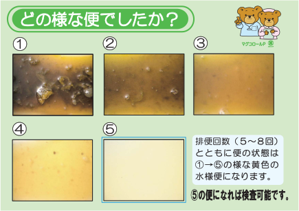 - 下剤の内服中は数回にわたって排便があり、便の状態は【固形→泥状→水様】に変化していきます。