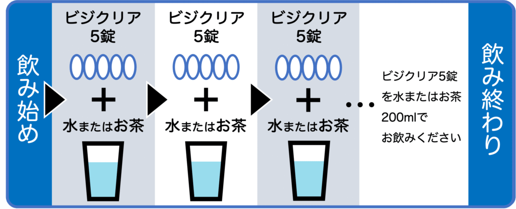 - ビジクリア5錠を15分以内に200 mLの水またはお茶で数回に分けて内服します。