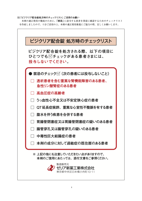また、ビジクリアは「低カリウム血症・高リン血症・低Ca血症などの電解質変動が起こりやすい」とされているため、腎機能が悪い方の場合は使用禁忌です。