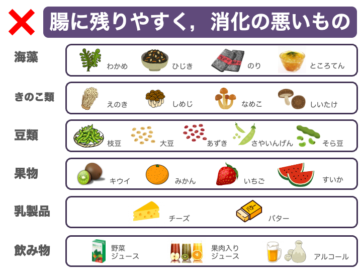 消化されにくく腸に残りやすいので検査前日は避けましょう。