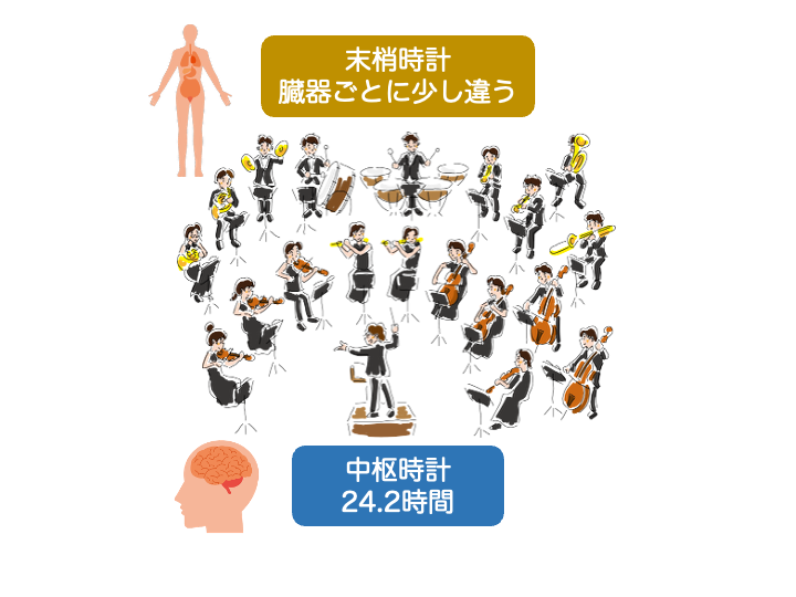 それぞれの周期は違っている各臓器の抹消時計を、中枢時計の視交叉上核がまとめて、