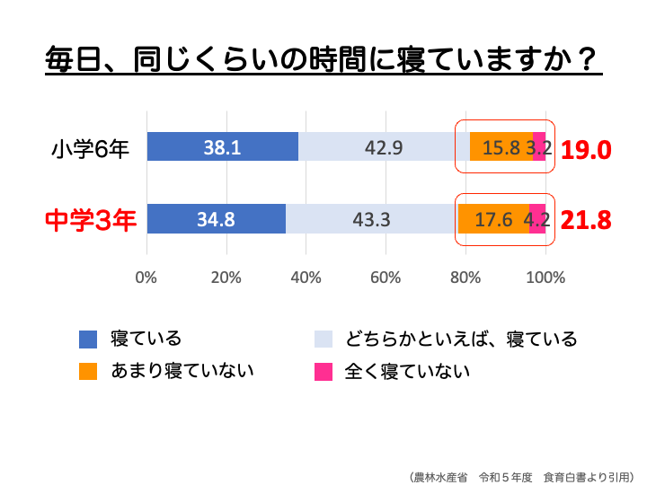 でも、寝る時間は、塾や部活で遅くなる日もあってバラバラになりがちだ、ということがこの調査から分かります。
