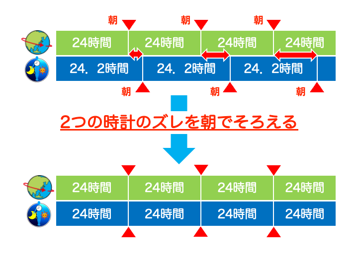 体内時計は24.2時間と、社会時計の24時間より少し長いので、毎日少しずつズレます。