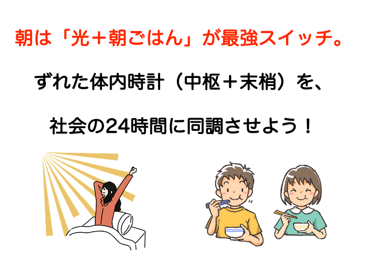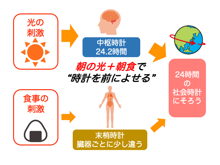 このため、朝起きて、朝の光を浴びて朝食を食べることで、体内時計を前進させて、24時間の社会時計に合わせることができます。