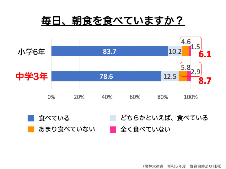 小学6年生と比較すると「毎日食べている」人が5%も減っているのは、気になるところです。