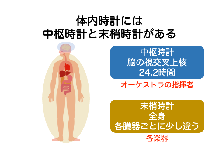 ヒトの体内時計には中枢時計と末梢時計があります。