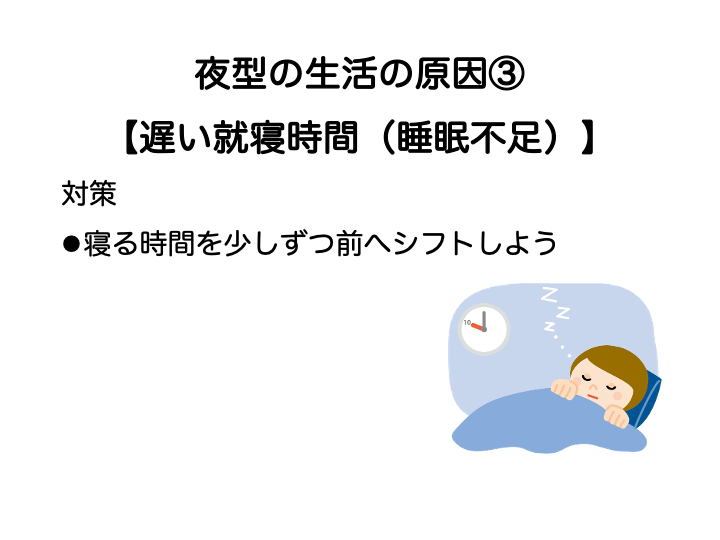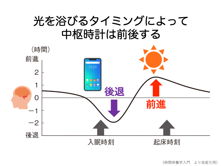 夜に光を浴びると逆に後退してしまい、体内時計のズレの原因となります。