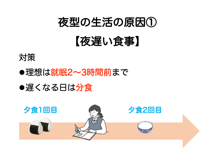 夜は寝る2〜3時間前には食事を終わらせ、食事が遅い日は軽めを心がけましょう。