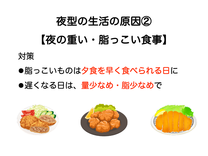 一方で、夜遅い時間の食事や、脂っこい食事、量が多い食事などは、