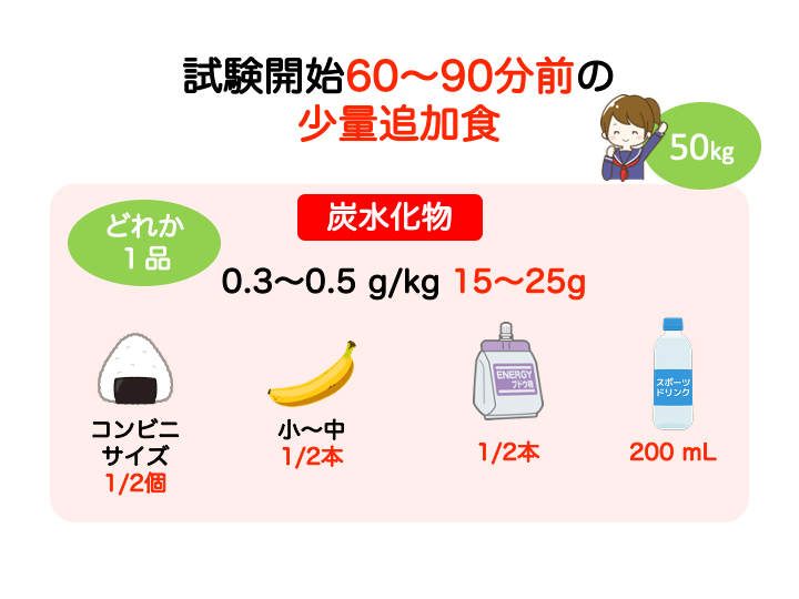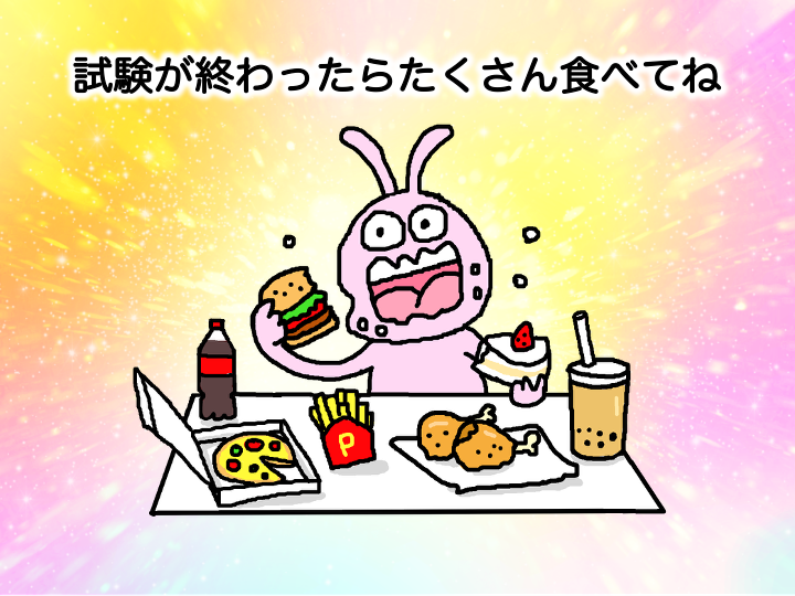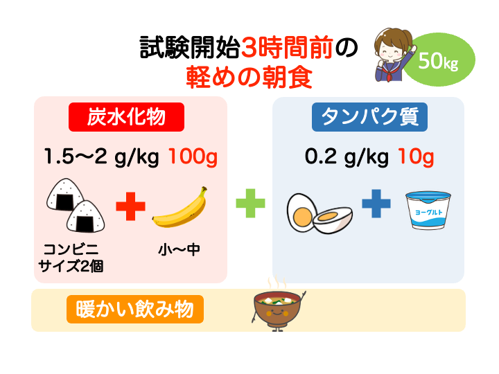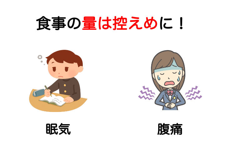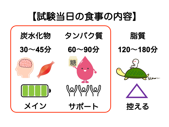 試験当日は朝からやや控えめの食事と内容で、頭をクリアにして試験に臨みましょう。