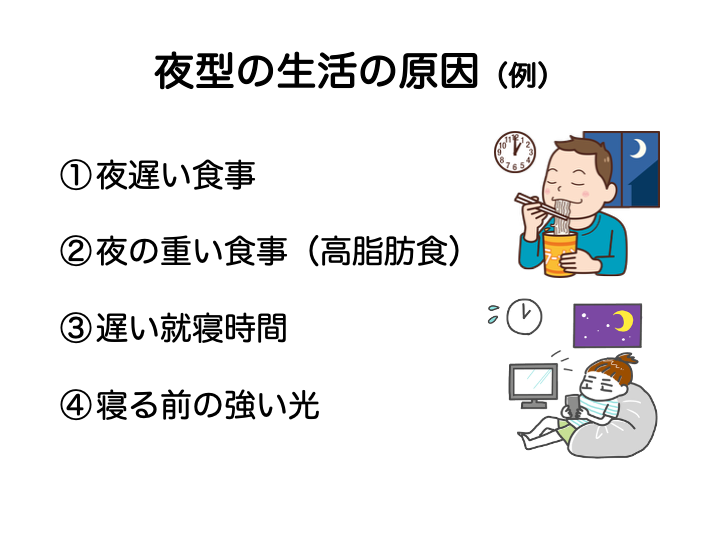 一方で、私たちの体には「体内時計」があり、睡眠・覚醒、体温、ホルモン分泌、代謝などを調節して体のリズムを作っています。